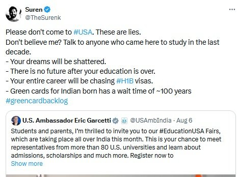Please don’t come to the USA if you're considering it, especially as a student. The dream sold to you is full of half-truths, and the reality is far from what you might expect. Your dreams will likely be shattered, and the future you envision may never materialize. Your entire career will be spent chasing H1B visas[1] and hoping for a green card, which, if you’re born in India, could take up more than 100 years[2].
